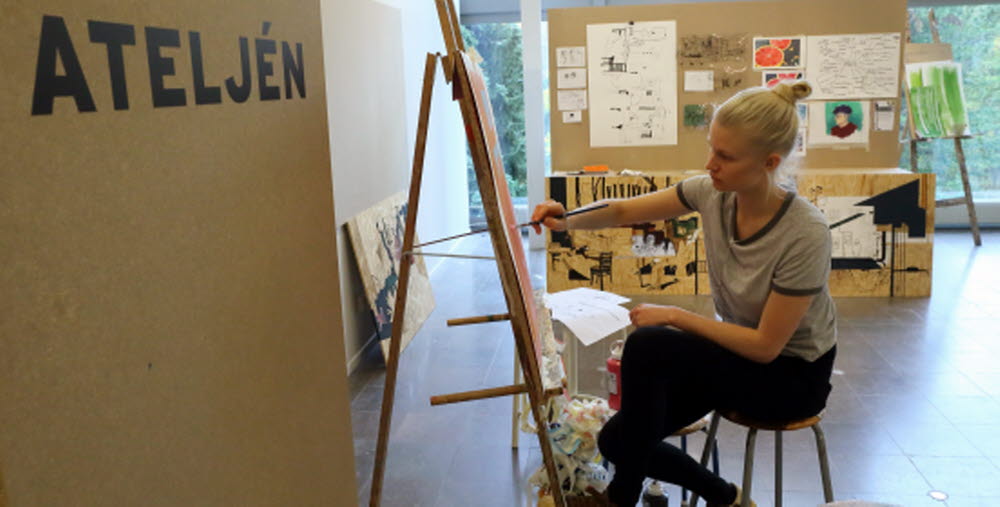 I ateljén är deltagarnas arbeten närvarande, med fokus på de studerandes vardag på Konstskolan. Här finns skisser, mer eller mindre färdiga arbeten, inspirationsmaterial, anteckningar, saker som lyckats och saker som misslyckats.