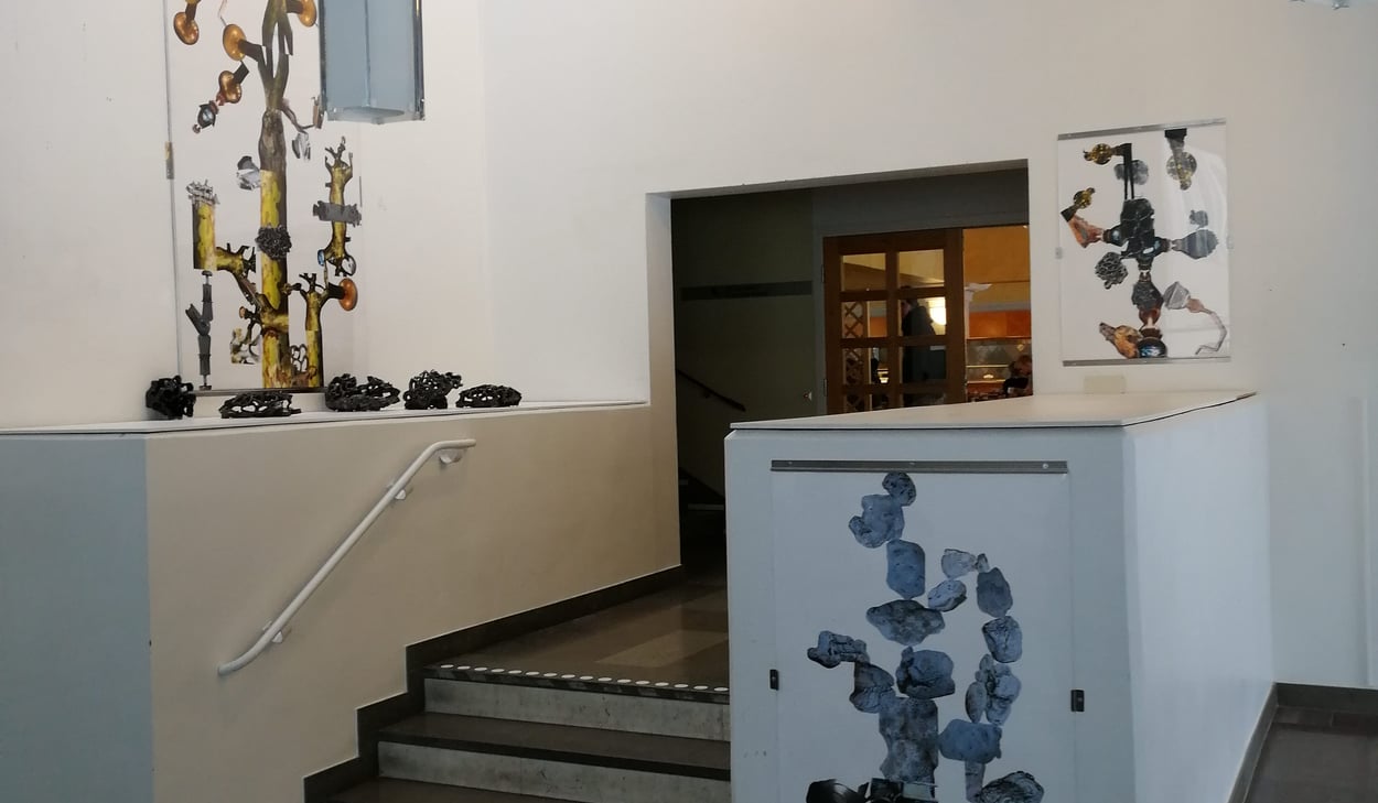 Jag tycker om att bygga, de här collagen har jag byggt av egna fotografier. I varje collage finns även bilder på några av mina keramikskulpturer. Ett urval av skulpturerna finns även med i utsmyckningen.