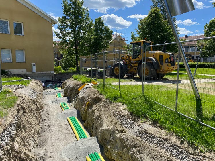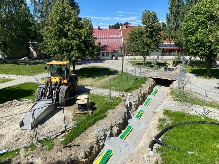 Under våren har skolgården grävts av i syfte att anlägga en ny kulvert med nya värmeledningar, fiber och elrör. Arbetet är omfattande och har pågått i ett par månader och fortsätter under sommaren.