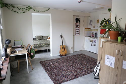 Minitvåa för en person, 34 m² (med möjlighet att hyras av två personer, priset per person blir då kostnad för måltider och halva hyran för lägenheten). Har vardagsrum och separat sovrum, nya tapeter och golv 2022, nya möbler inköpta 2023. De ligger i hus 06 och har egen toalett och dusch samt litet pentry med eget kylskåp, diskbänk finns, ej matlagningsmöjlighet. Huset har en trappuppgång, likt ett lågt hyreshus i två plan samt källare. I trappuppgången finns sex rum varav två har separat sovrum, övriga fyra rummen är vanliga stora rum, se ovan. Här finns gemensamt kök och sällskapsrum, med tvättstuga i källarplan.