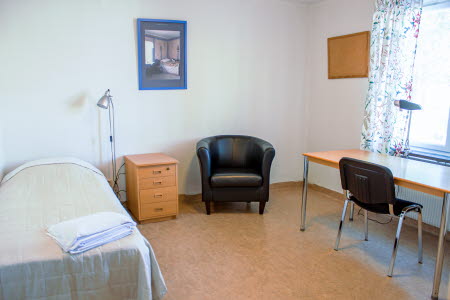 Rummen är möblerade med säng, täcke, kudde, skrivbord, stol och bokhylla. De gemensamma utrymmena på elevhemmen städas av skolans serviceteam.