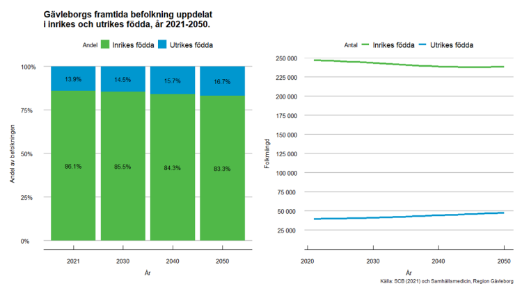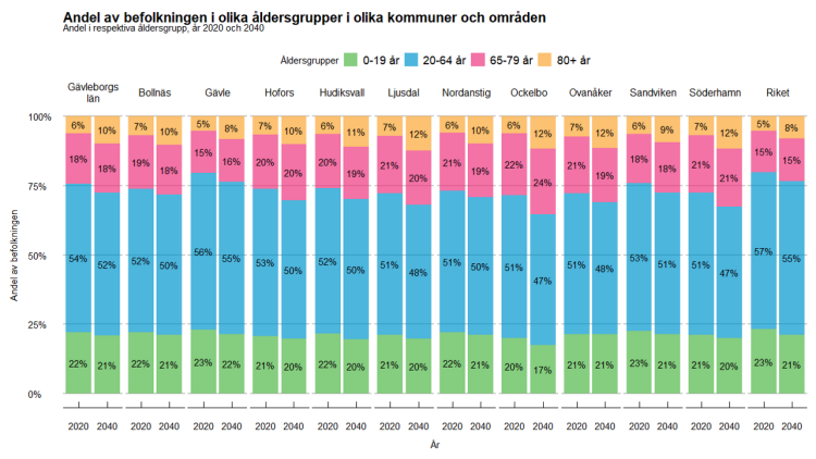 Den största förändringen jämfört med tidigare prognoser är att den förväntade invandringen har skrivits ner. Antalet inrikes födda minskar mer än vad antalet utrikes födda ökar och således minskar Gävleborgs befolkning. Länets demografi i förhållande till ålder kommer också förändras. Antalet personer över 80 år kommer öka med över 70% fram till 2050 enligt prognosen, samtidigt som resterande åldersgrupper minskar. Befolkningspyramiden nedan visar att åldersgrupper beräknas trappa av i storlek vid ungefär 83 års ålder år 2050, istället för ungefär 76 års ålder som idag.