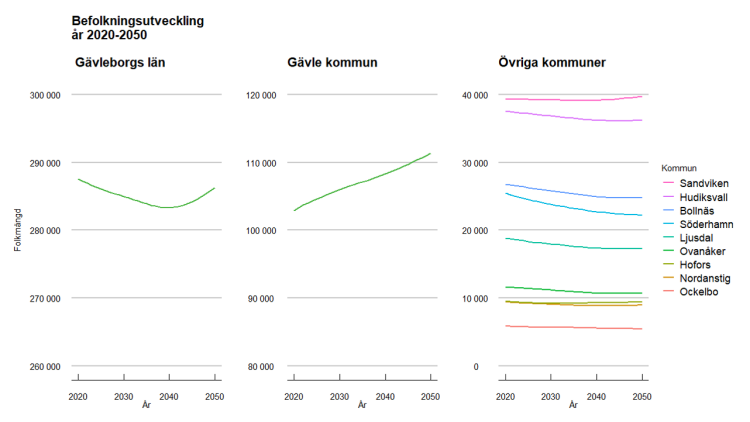 Gävleborgs befolkning förväntas minska fram till 2040 för att sedan börja återhämta sig. Gävle förväntas ha en konstant befolkningstillväxt fram till 2050. För övriga kommuner prognosticeras en befolkningsminskning de närmaste åren som förväntas plana ut ungefär år 2040, beroende på kommun. Minskningen kan förklaras av ett negativt födelsenetto som inte täcks upp av inflyttningar till kommunerna. På sikt förväntas dock flyttnettot öka i dessa kommuner. Det skulle alltså kunna leda till att de inte längre minskar i befolkning och därmed att länet som helhet ökar.