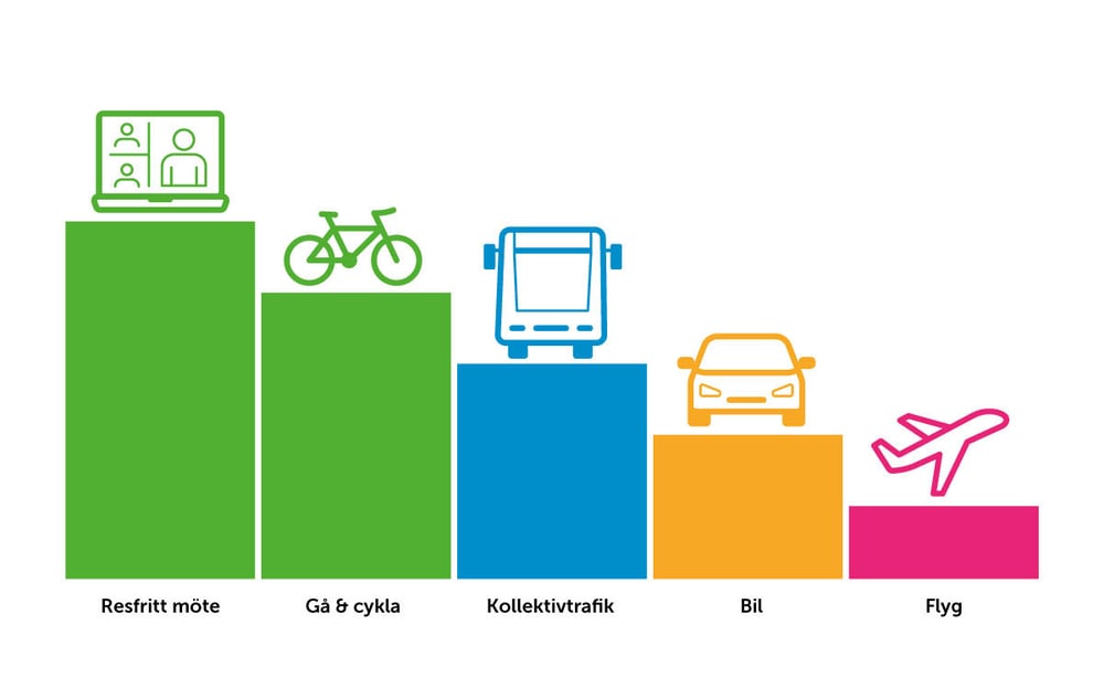 Vid behov av möte tar vi hänsyn till vilka som behöver närvara och om mötet ska ske digitalt eller fysiskt. Om deltagare reser till mötet så anpassas mötestiden till kollektivtrafiken. För att resan ska bli så hållbar som möjligt ska vi välja det färdsätt som främjar hälsan och är mest klimat- och kostnadseffektivt.