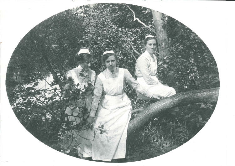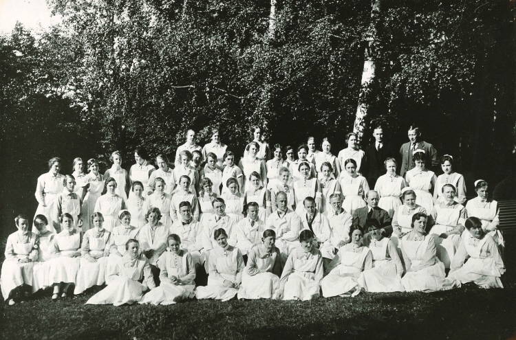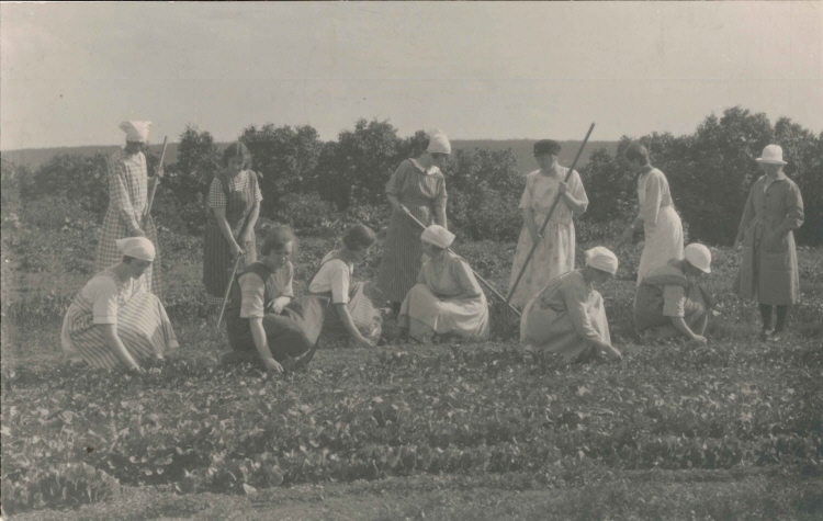 Gävle lasarett, sjuksköterskeelever i sjukhusparken 1912. Ingeborg Jonsson.