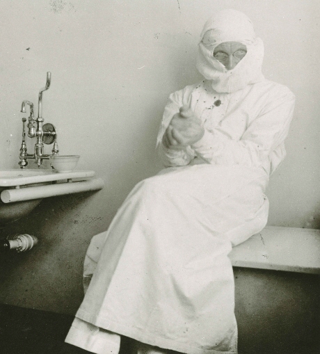 Månadens fotografi föreställer en kuslig figur från början av förra seklet iförd kläder med blodfläckar på. Bakgrunden är dock inte så spöklik som bilden ger sken av. Mannen i bild är doktor Landelius vid lasarettet i Hudiksvall och på bilden är han iförd en, för tiden, typisk operationsuniform. När fotografiet togs hade han precis avslutat en operation, därav blodfläckarna på hans kläder.