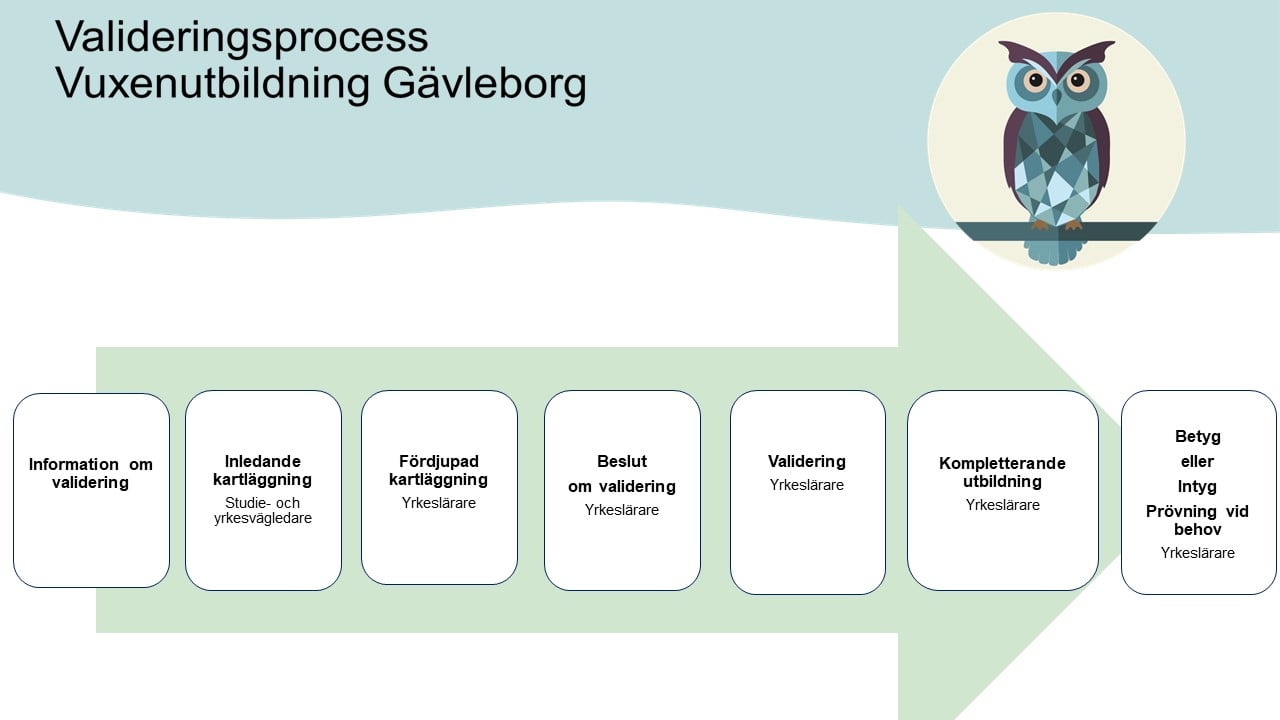Valideringsprocessen innehåller flera steg och kommunernas vuxenutbildningar i Gävleborg arbetar utifrån en gemensam process. Vid en validering kartläggs, dokumenteras, värderas och erkänns de kunskaper och erfarenheter du har mot uppsatta krav inom ett område eller en kurs.