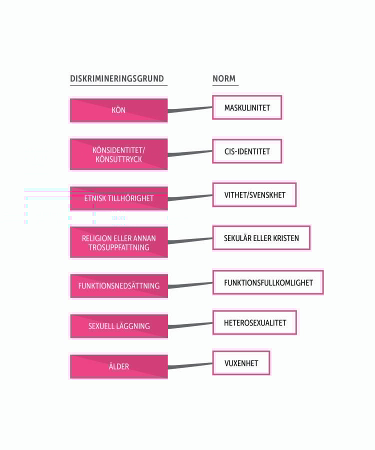 Bilden visar de olika diskrimineringsgrunderna och vilken norm som, på samhällsnivå, är den dominerande. Att inte tillhöra den dominerande normen kan vara begränsande.