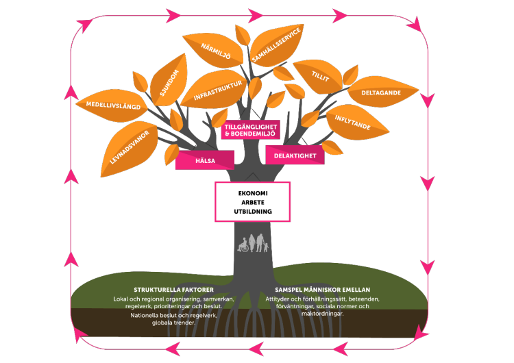 I trädets stam finns områdena utbildning och arbete och ekonomi. Dessa områden utgör de grundläggande socioekonomiska livsvillkoren, som i sin tur påverkar utfallen inom de områden som finns i trädets grenar; hälsa, tillgänglighet & boendemiljö samt delaktighet.