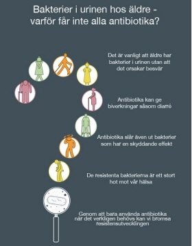 Affisch för exempelvis väntrum. "Bakterier i urinen hos äldre - varför får inte alla antibiotika?" Finns på flera olika språk.