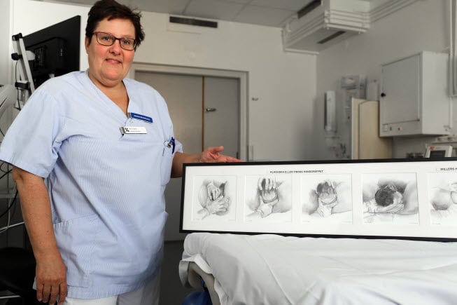 | Förlossningsvården i Hudiksvall har gjort sig rikskända genom införandet av ”finska greppet”, en metod att stödja muskulaturen vilket minskar förlossningsskadorna hos de födande mammorna. Ann-Gerd Nilsson är en av barnmorskorna som ser till att metoden praktiseras och lärs ut till nyanställda. ”Vårt mål är att hjälpa kvinnan att få den bästa upplevelse hon kan av förlossningen”, säger Ann-Gerd. |