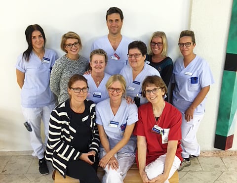 | Några av de medarbetare inom kvinnosjukvården i Hudiksvall, som tillsammans lyckats skapa 100 procents tillgänglighet. Övre raden fr v: Johanna Strandberg, sjuksköterska, Karin Fast, vårdenhetschef, Gabor Harsanyi, läkare, Kim Hald, chefsstöd, Maria Hägg, undersköterska. Mitten: Margareta Kjörling, barnmorska, Ann-Gerd Nilsson barnmorska. Nedre raden fr v: Maria Nilsson, chefstöd, Barbro Lindblom, sjuksköterska, Elisabeth Sjöström, barnmorska. |