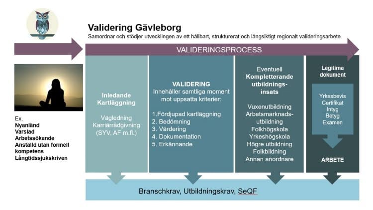Genom en kvalitetssäker valideringsprocess får personen papper på sin kunskap och kompetens och ges rätt förutsättningar i förhållande till aktuella krav på arbetsmarknad och inom utbildning.