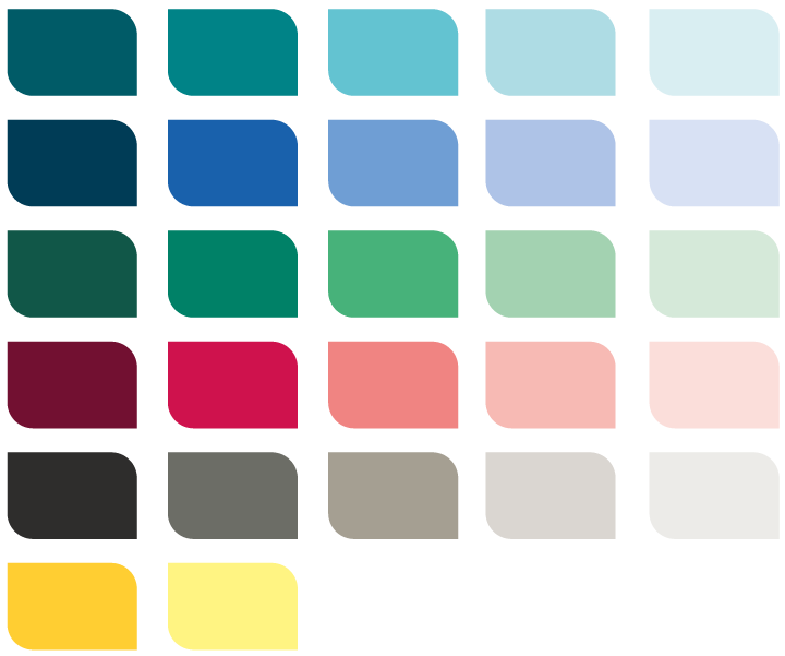 Paletten består av totalt 27 färgtoner och är anpassad för att fungera i alla kanaler. Alla färger har angivna färgkoder för RGB och CMYK längre ner på denna sida..