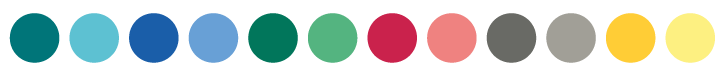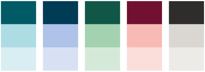 Vi använder oss av fem färgteman (turkos, blå, grön, röd och grå) som är våra identitetsskapande färger. Alla färgteman har samma värde och de varierar lika mycket i vår kommunikation. Varje färgtema består av en mörk och två ljusa nyanser. Dessa färger används i första hand och på de största ytorna i vår kommunikation så som bakgrunder, färgfält, rubriker och grafiska element.